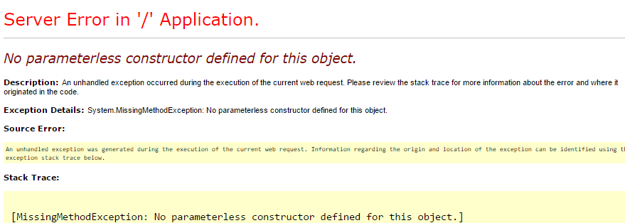 PersonModel. Siden browseren ikke kan sende C#-objekter, er det MVC-rammeverket som må opprette objektet utifra parameterene som kommer inn med POST-requesten fra skjemaet. For at det skal klare å opprette et nytt objekt må PersonModel ha en tom konstruktør. Vi går til PersonModel.cs og legger til en konstruktør:public class PersonModel