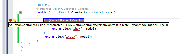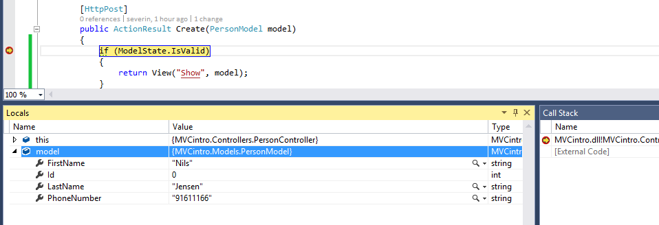 Den røde prikken indikerer at breakpoint et er satt. Bygg på nytt med debugging (F5). Send inn skjemaet og koden stopper nå midt i Create-metoden. Benytt sjansen til å titte litt rundt i PersonModel-objektet, det kan være greit å gjøre når man skal debugge: